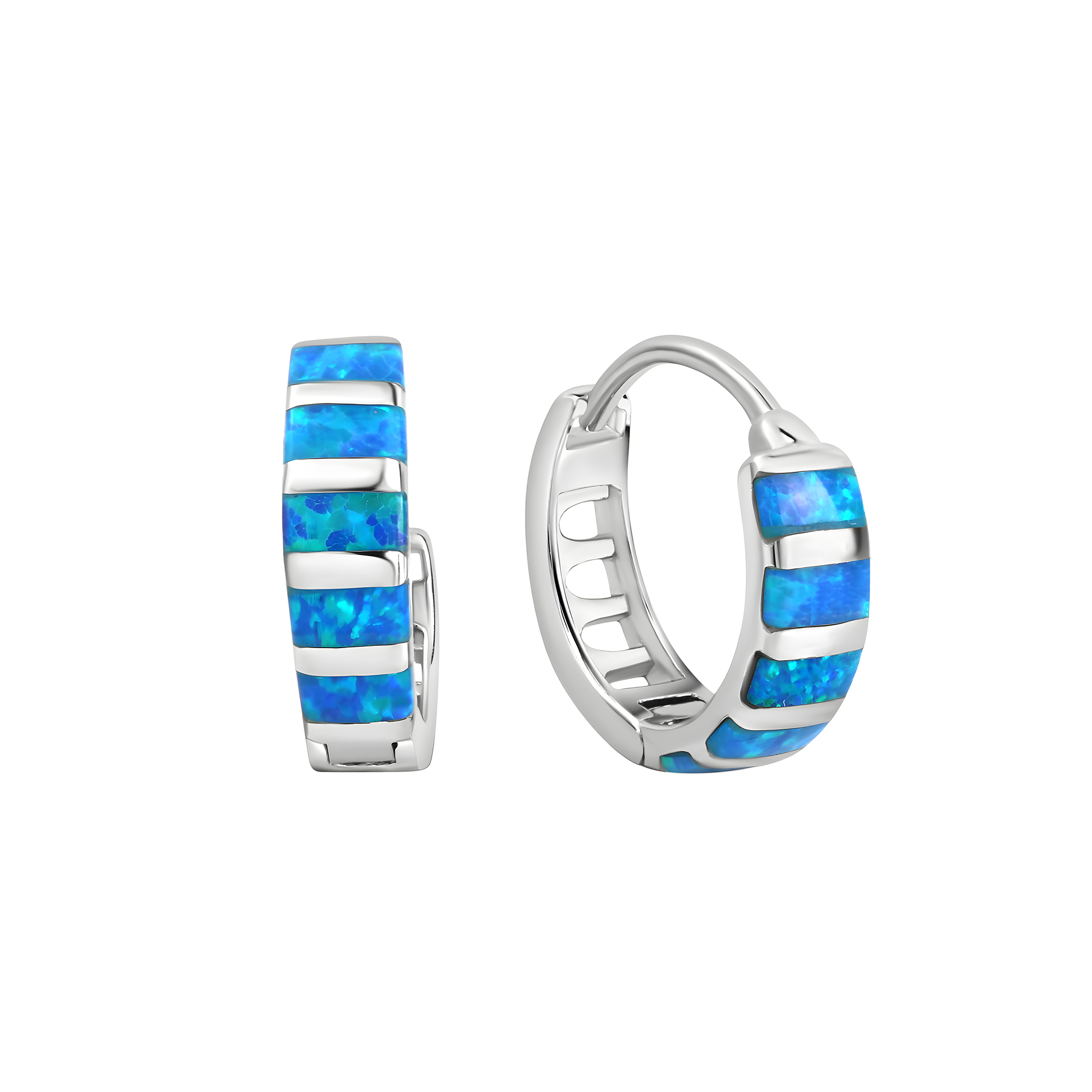 Moderne Klappcreolen aus 925/- Sterling Silber rhodiniert. Veredelt mit synthetischem Opal. Durchmesser 13mm. Hochwertige Verarbeitung. Das perfekte Geschenk zu jedem Anlass. .