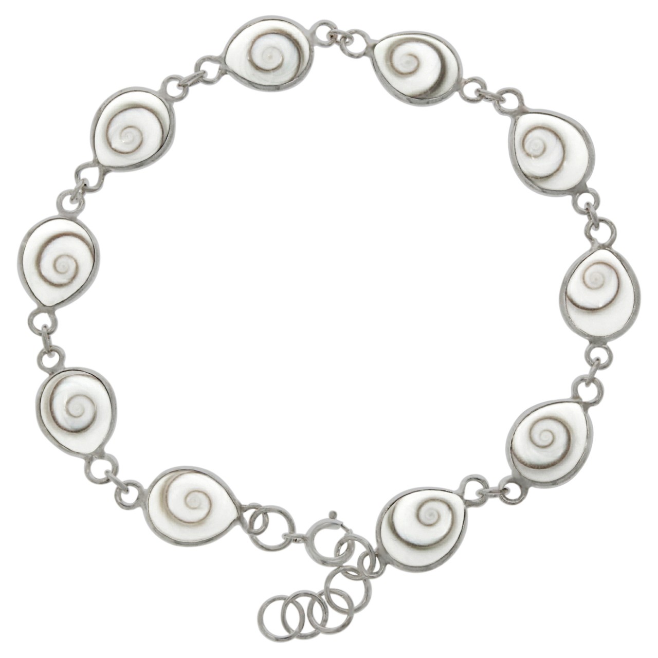 Armband aus 925 Sterling Silber. Silberarmband mit weißen Muscheln. 10 Muschelelemente in Tropfenform. Schmuckstück in schönem Geschenk Etui verpackt. Ein ideales Geschenk für Frauen. .