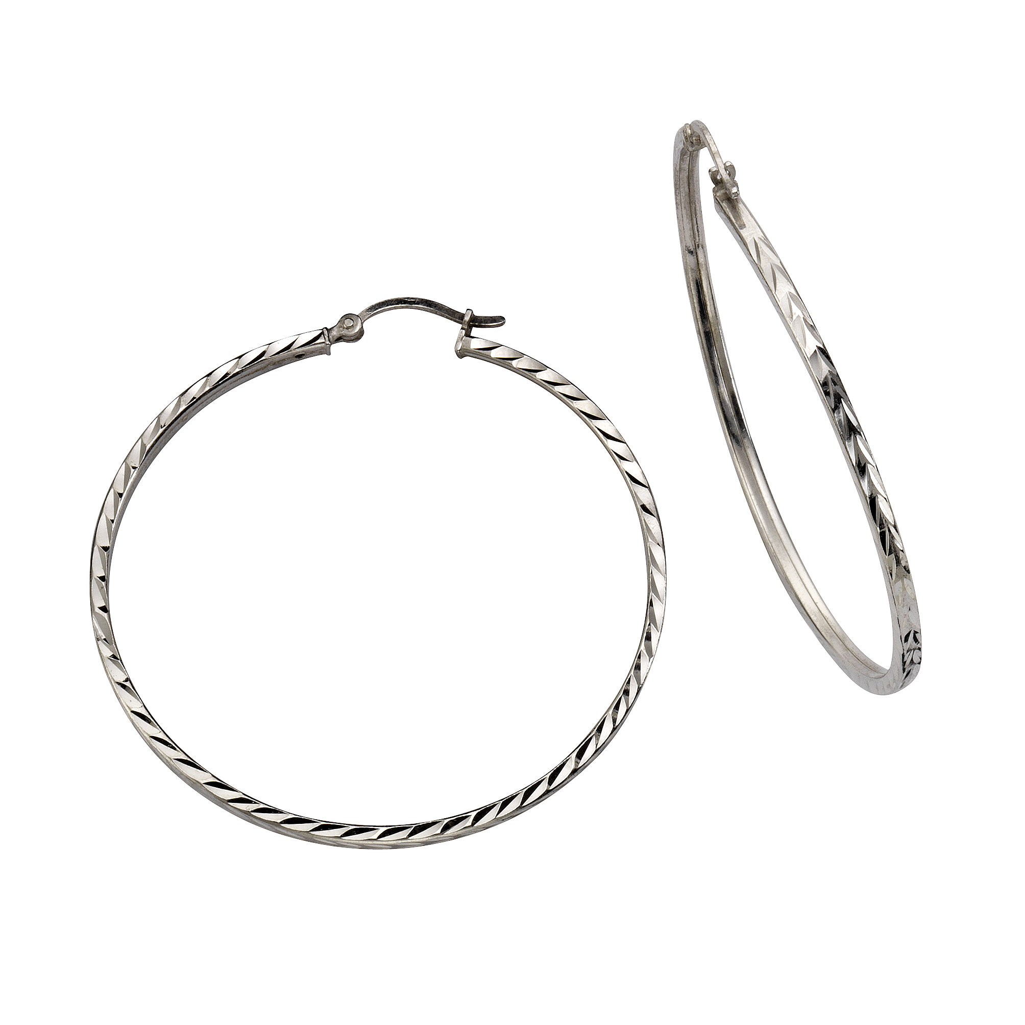 Klassische Creolen aus rhodiniertem 925 Silber . Wird zum Hingucker durch diamantierte Oberfläche . Angenehmer Tragekomfort und anlaufgeschützt. Ohrringe mit 5cm Durchmesser hochglanzpoliert. Ideales Geschenk für Frauen. .