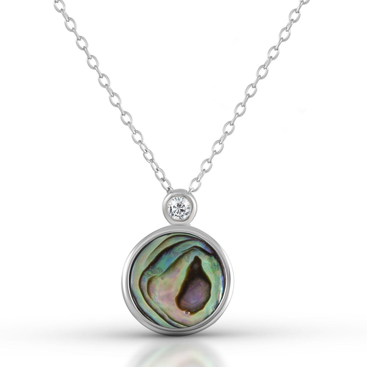 Halskette aus 925 Sterling Silber rhodiniert. Anhänger mit Abalone und Zirkonia. Zeitlos schönes Design, hochwertig verarbeitet. Schmuckstück in schönem Geschenk Etui verpackt. Ein ideales Geschenk für Frauen. .