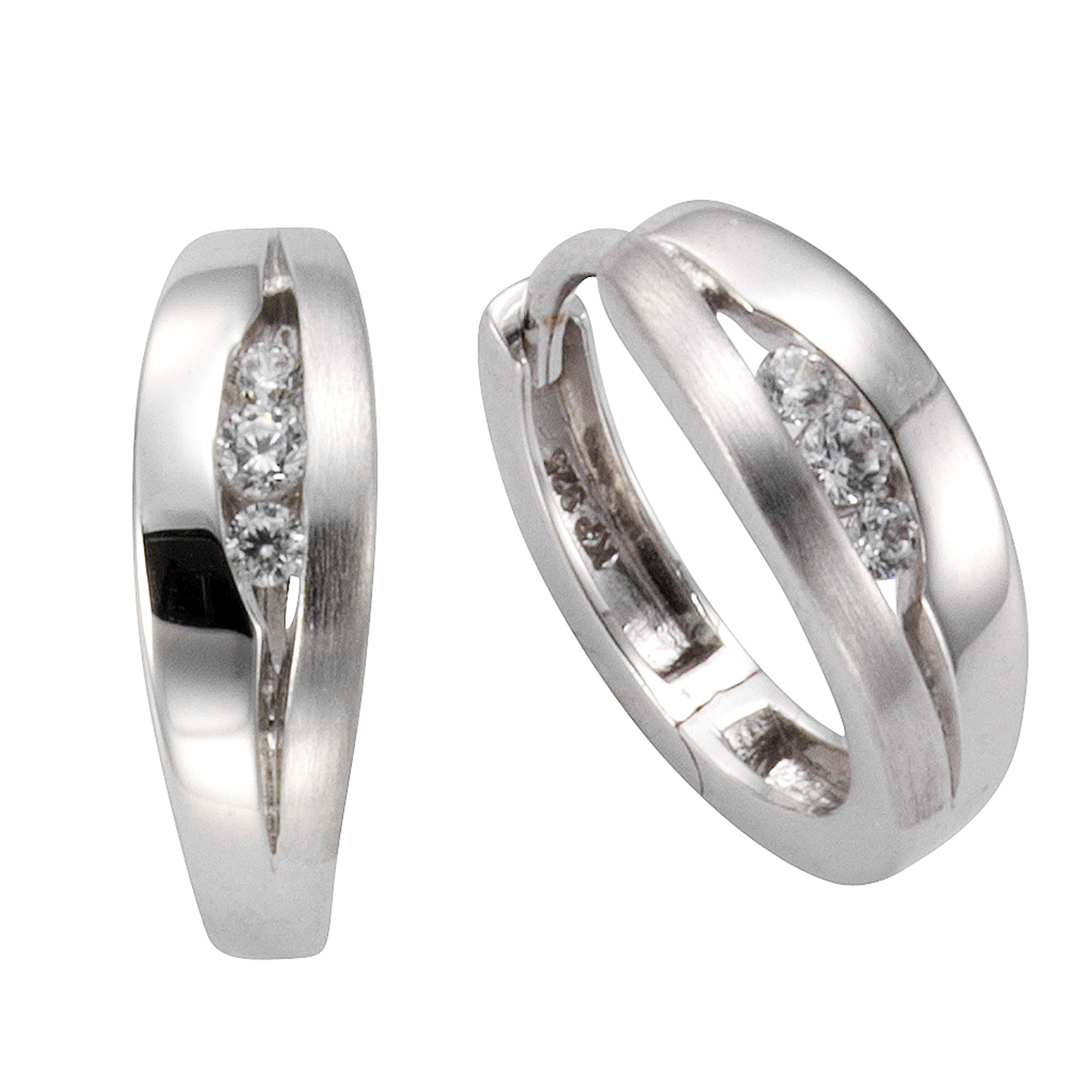 Elegante Creolen aus 925-/ Sterling Silber rhod.. Angenehmer Tragekomfort und anlaufgeschützt. Klappverschluss sorgt für einen sicheren Halt. Ohrringe mit je 3 weißen Zirkonia-Steinen besetzt. Schönes Geschenk für Freundin oder Partnerin. .