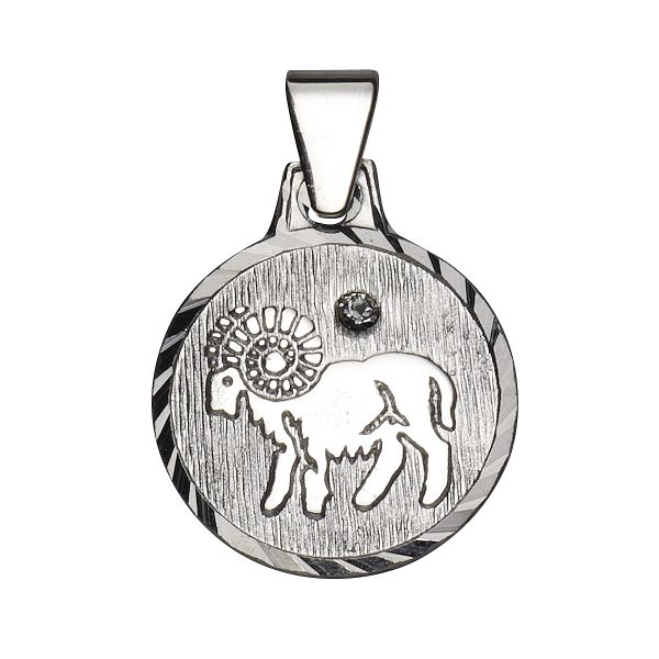 Klassischer Anhänger aus 925/- Silber rhod.. Sternzeichen-Symbol “Widder”. Hochglanzpoliert und anlaufgeschützt. Veredelt mit einem weißen Kristall. Schönes Accessoire – auch für den Alltag!. .