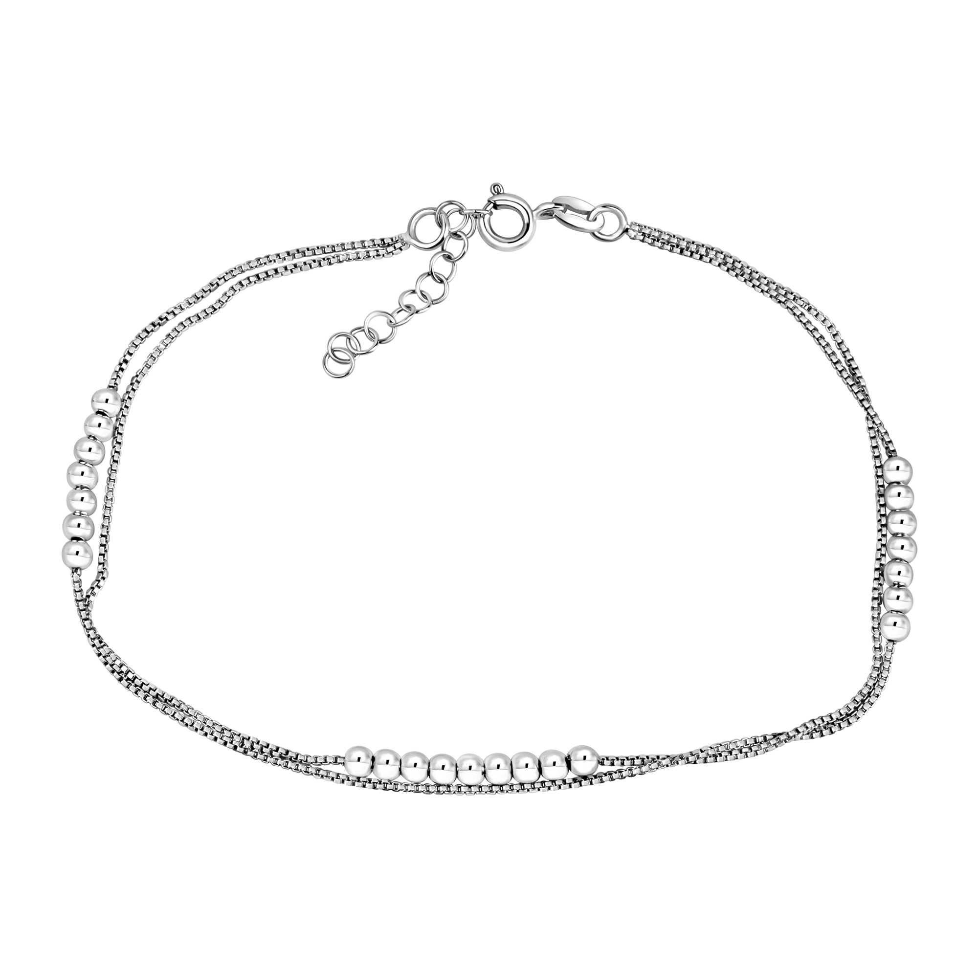Bezaubernde Fußkette aus 925/- Sterling Silber rhodiniert. Zweireihig verziert mit Kugeln. Länge 23+3cm mit Federring. Hochwertige Verarbeitung. Das perfekte Geschenk zu jedem Anlass. .