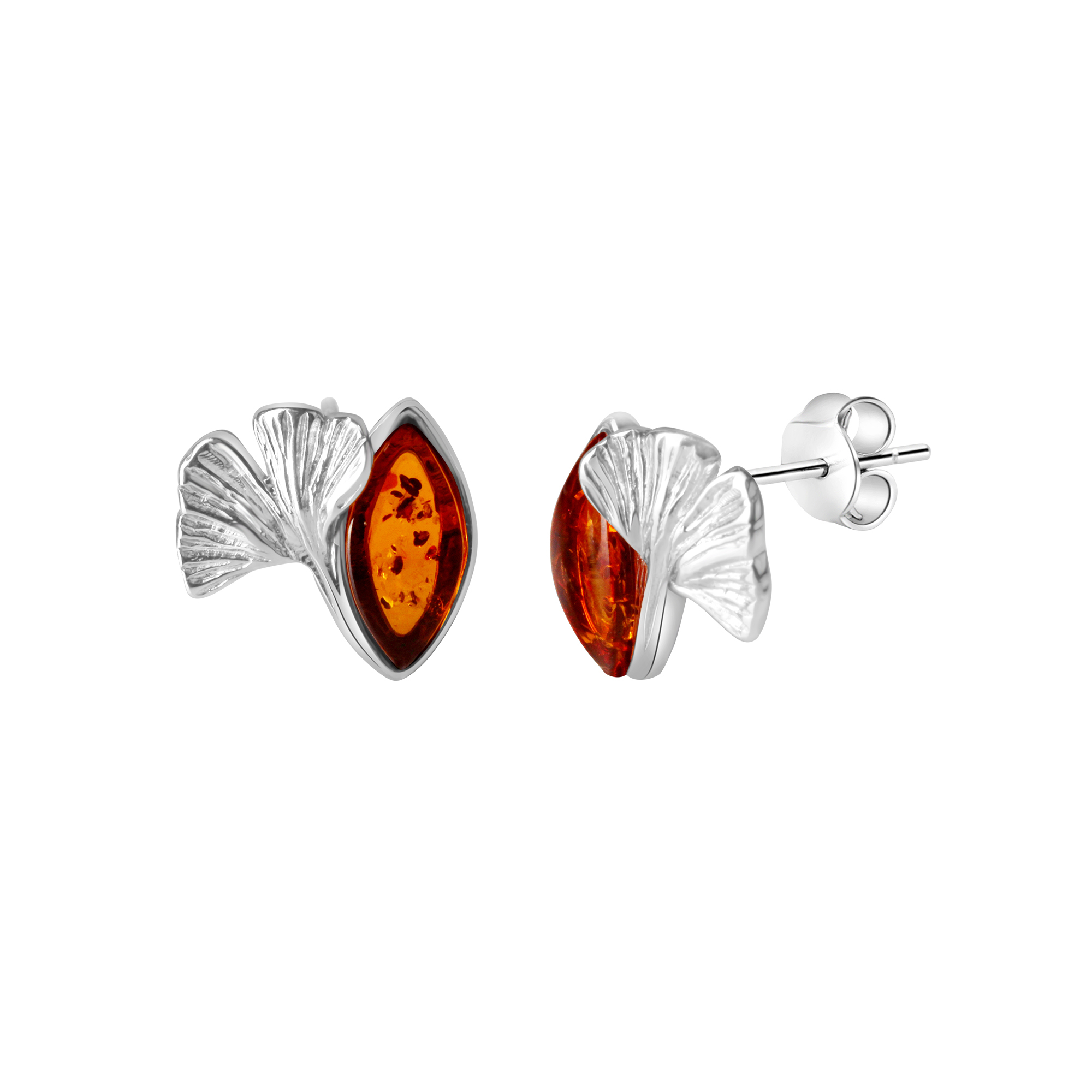 Edle Ohrstecker aus 925/- Silber rhodiniert. Veredelt mit echtem Bernstein. Motiv Gingko-Blatt. Hochwertig gefertigt aus edlen Materialien. Das ideale Geschenk für besondere Anlässe. .