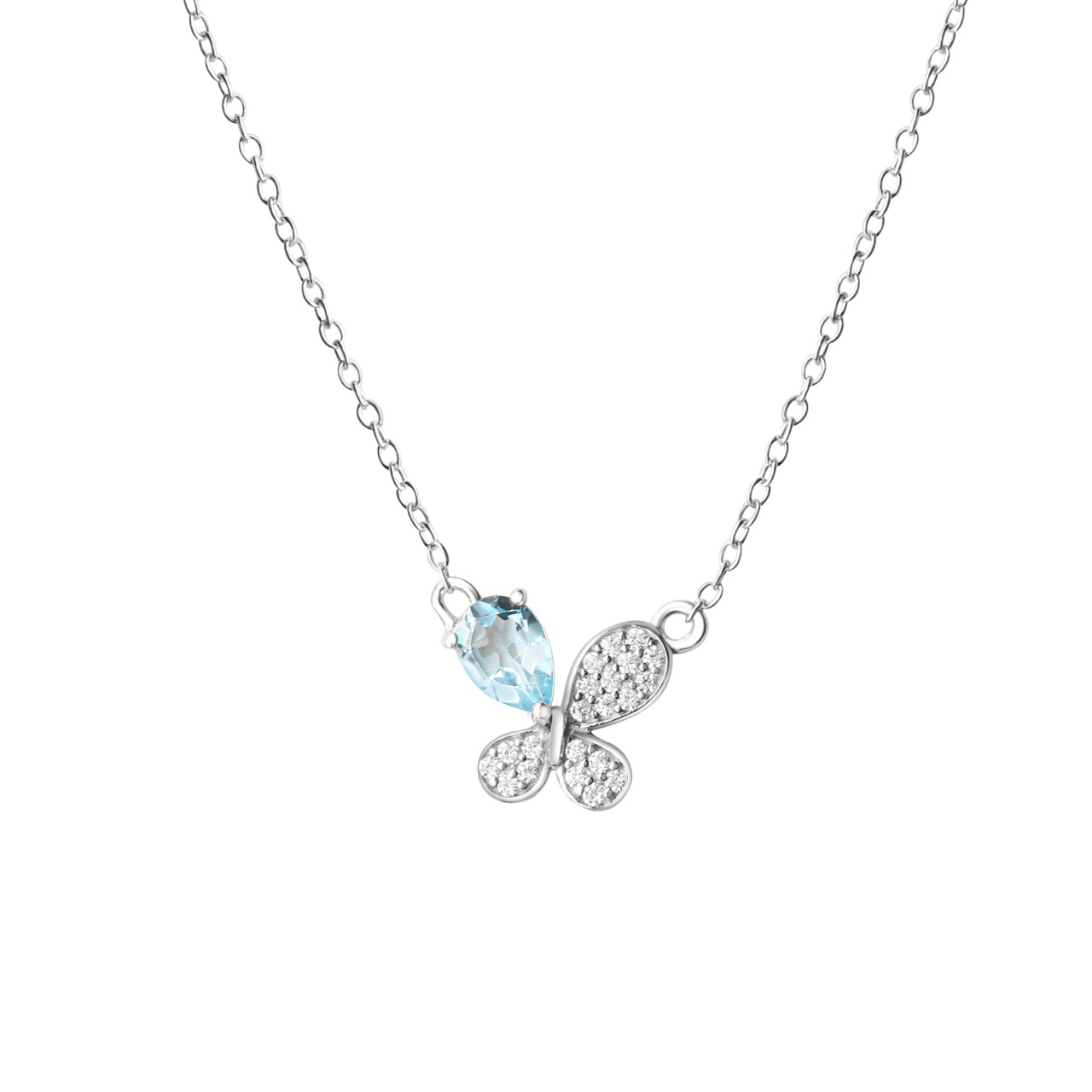 Zartes Collier aus 925/- Sterling Silber rhodiniert. Veredelt mit 1 Blautopas und Zirkonia. Florales Blumenelement. Hochwertige Verarbeitung. Das ideale Geschenk für besondere Anlässe. .