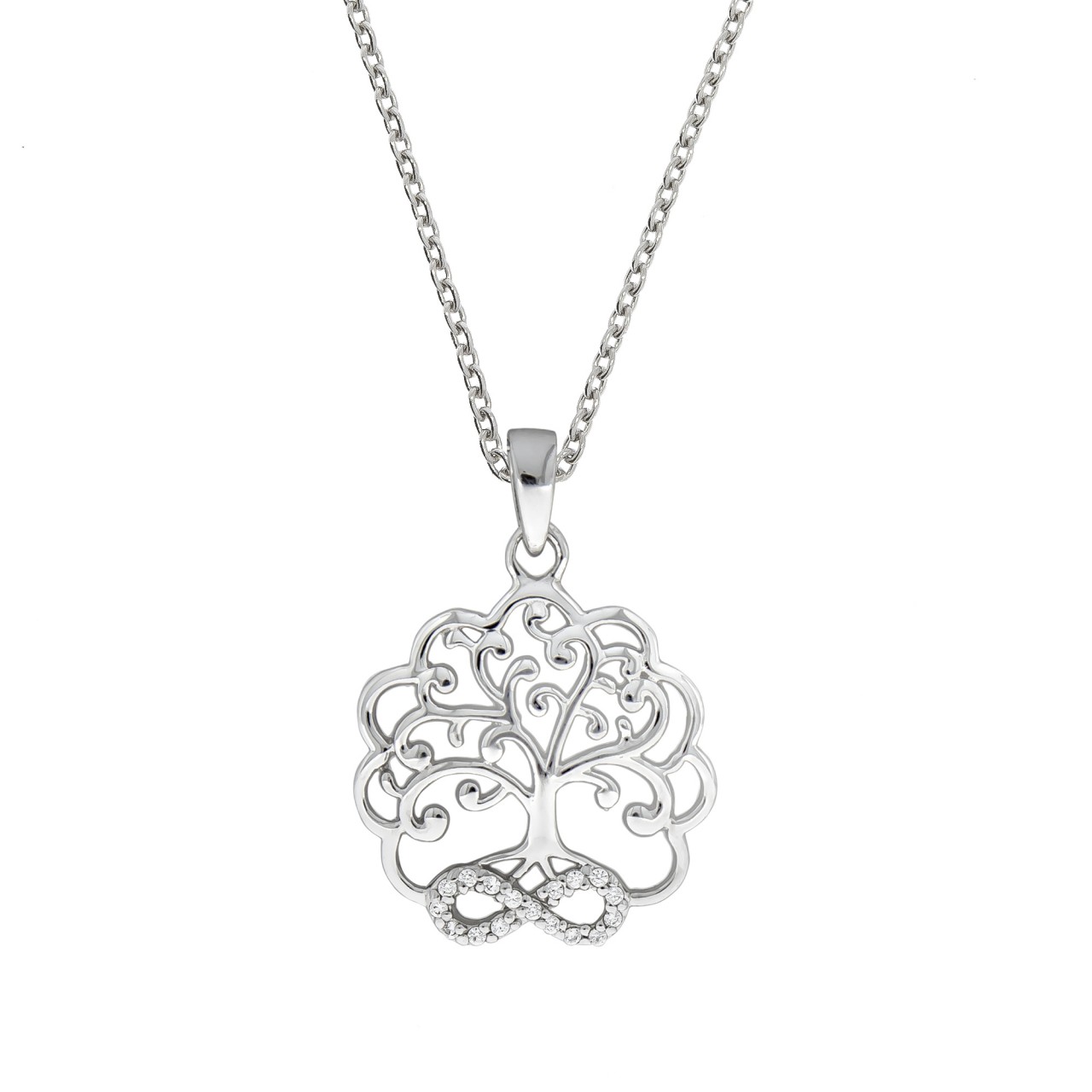 Edle Halskette aus echtem 925 Silber rhodiniert. Filigranes Lebensbaum Motiv. Ergänzt durch ein Unendlichkeitszeichen. Anhänger besetzt mit funkelndem weißen Zirkonia Steinen. Das ideale Geschenk für besondere Anlässe. .