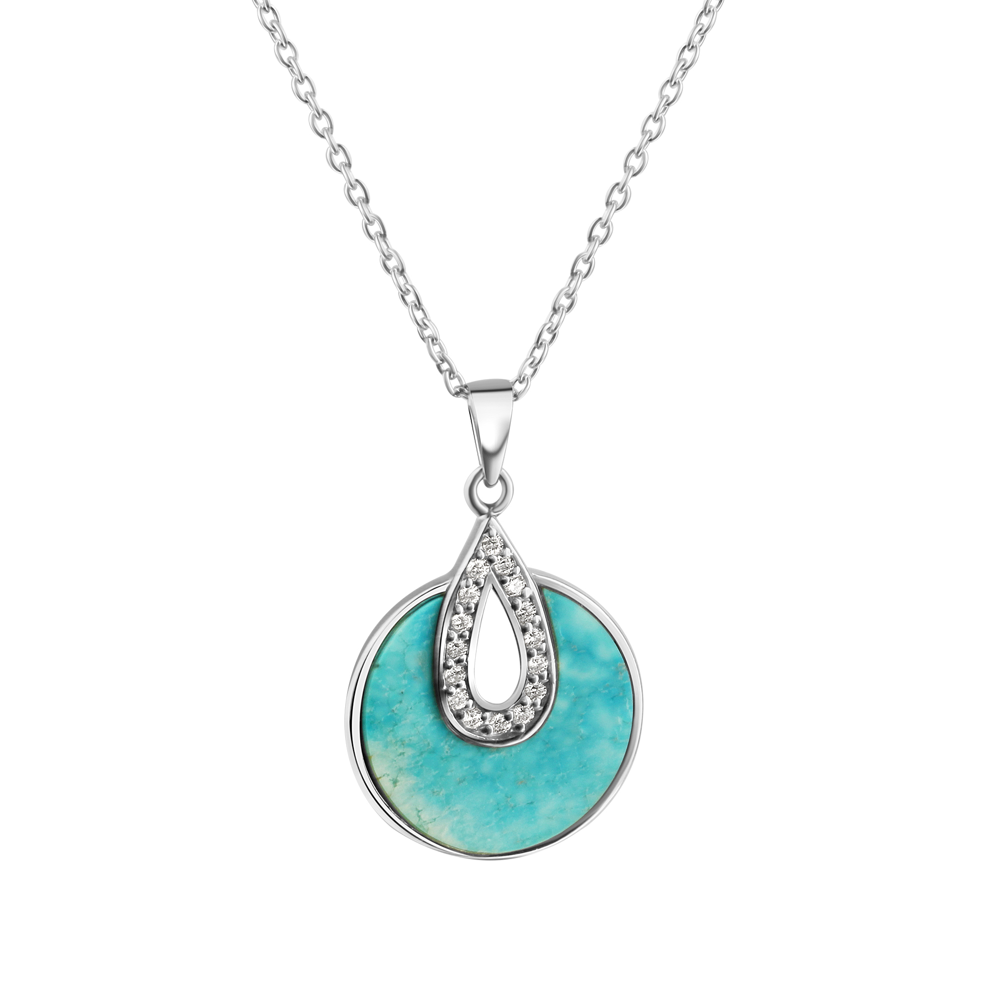 Edles Collier aus 925/- Sterling Silber rhodiniert. Anhänger rund mit 1 Türkis und 16 weißen Zirkonia. Ankerkette 45cm lang. Hochwertige Verarbeitung. Eine hervorragende Geschenkidee zu den verschiedensten Anlässen. .