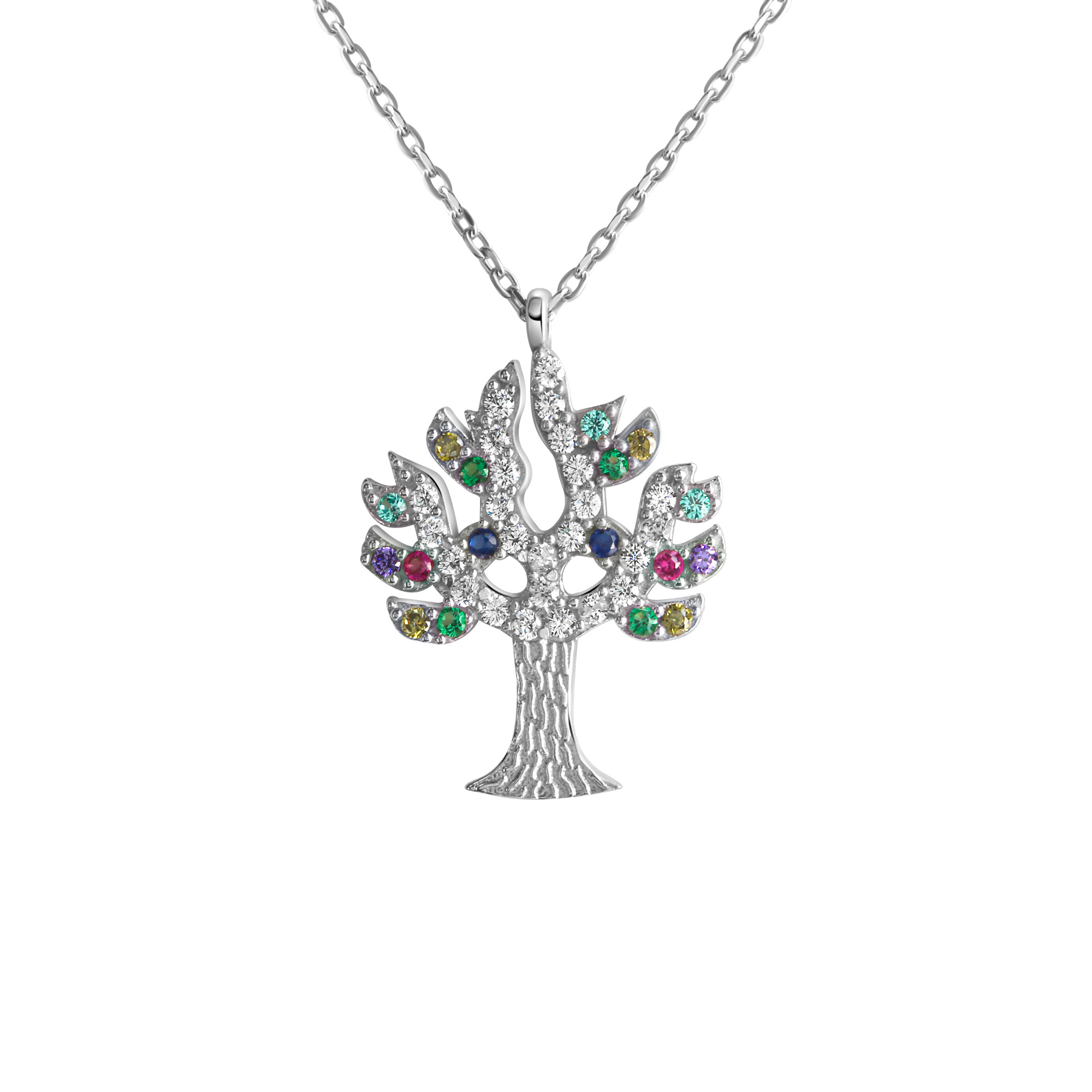 Filigrane Ankerkette aus 925/- Silber rhodiniert. Mit Anhänger Lebensbaum. Veredelt mit bunten Zirkonia. Hochwertige Verarbeitung. Das ideale Geschenk für besondere Anlässe. .