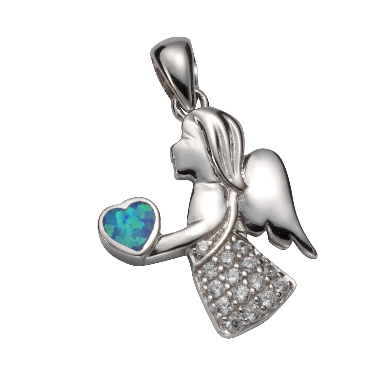 Engel-Anhänger aus 925/- Sterling Silber rhodiniert. Mit synth. Opal als Herz. Verziert mit 15 weißen Zirkonia-Steinen. Hochglanzpolierte Oberfläche. Hochwertige Verarbeitung. .