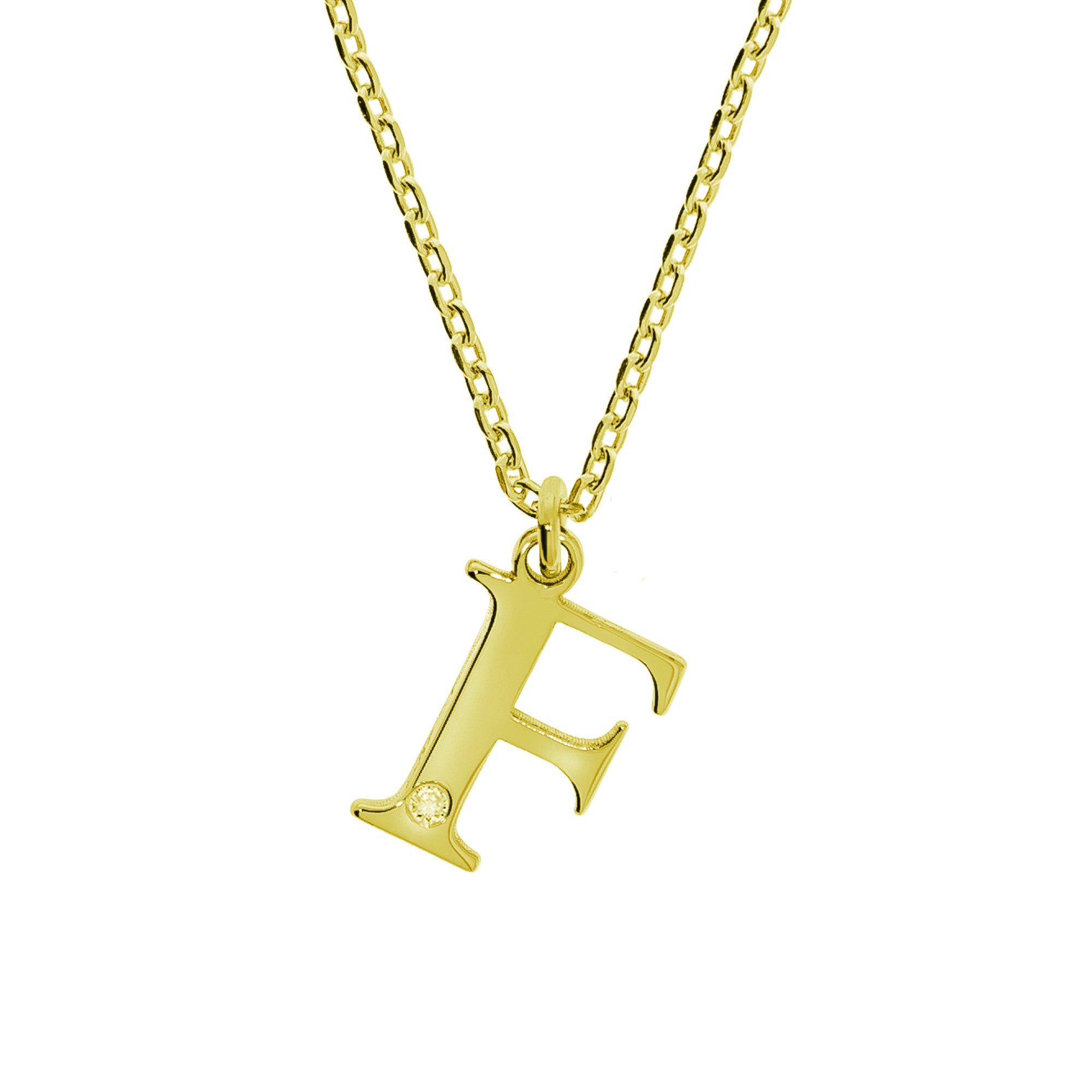 Kette mit Anhänger aus 925/- Sterling Silber vergoldet. Buchstabe F. Veredelt mit 1 Diam. 0,008 ct.. Länge 45+3 cm. Ideal als elegantes Geschenk zum Geburtstag, Jubiläum oder anderen besonderen Anlässen. .