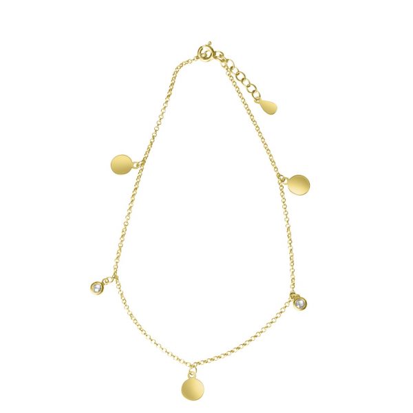 Fußkette aus 925/- Sterling Silber vergoldet. Mit 3 Plättchen glanz und 2 Zirkonia weiß. Variabel in der Länge. Hochwertige Verarbeitung. Das ideale Geschenk für besondere Anlässe. .