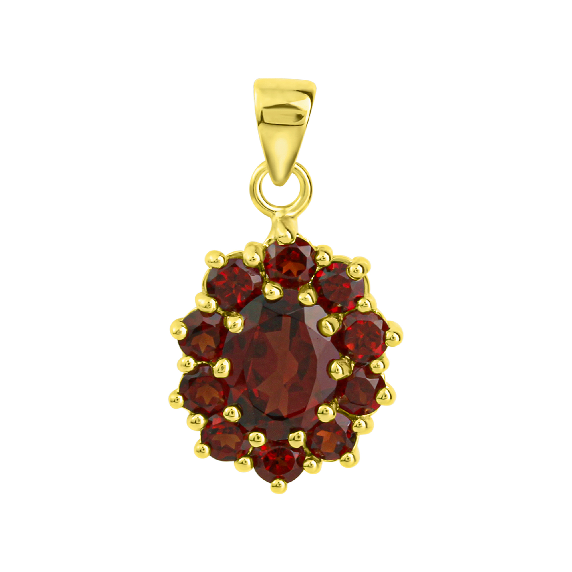 Edler Anhänger mit 11 funkelnden Granat-Steinen. Hochwertig vergoldetes 925/- Sterling Silber. Gesamtlänge 2,2cm. Hochwertige Verarbeitung. Ideales Geschenk für die Frau oder Freundin. .