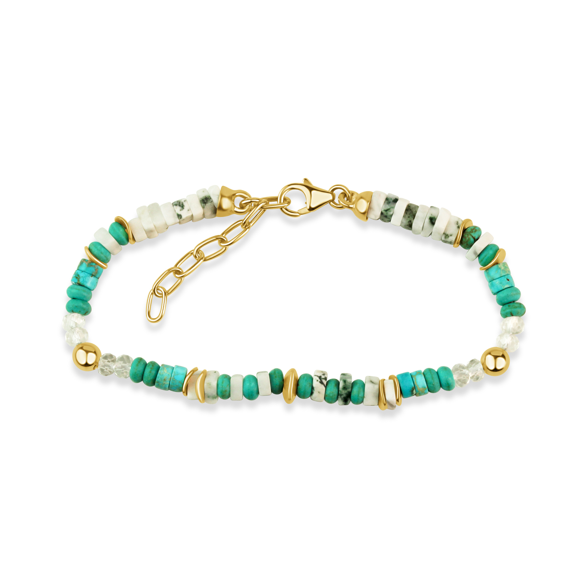 Bezauberndes Armabnd aus 925/-Sterling Silber vergoldet. Veredelt mit Türkis uns Jaspis. Länge 18+3 cm mit Karabiner. Hochwertige Verarbeitung. Eine hervorragende Geschenkidee zu den verschiedensten Anlässen. .
