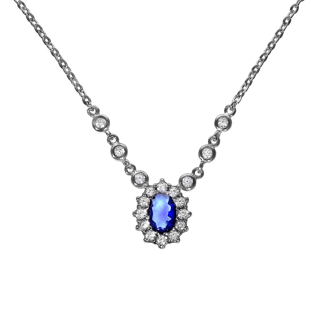 Elegantes Collier aus 925 Silber rhodiniert. Das ideale Geschenk für Frauen. Weißer Zirkonia und Blauer Glaskristall. Hochglanzpolierte Oberfläche und anlaufgeschützt. Qualitativ hochwertig, einzigartiges Design. .